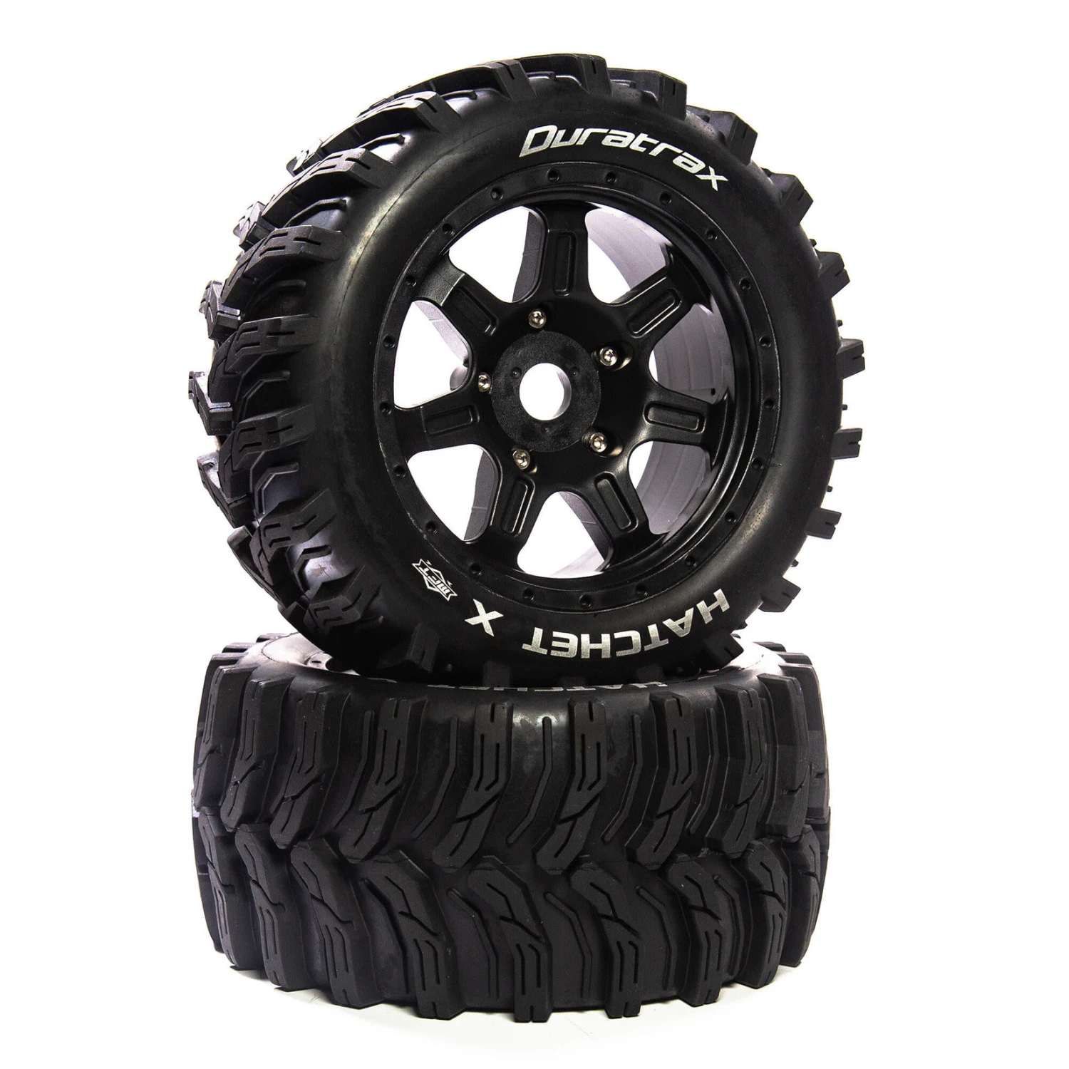 For running on a variety of surfaces Duratrax offers these factory mounted 1/5 scale HATCHET X MT front/rear tires for the ARRMA KRATON 8S monster truck and ARRMA OUTCAST 8S stunt truck. They feature a tread pattern thatβs perfect for a wide range of surfaces: pavement; loose dry loamy dirt, loose wet mud, hard-packed wet dirt and grass. Molded from a durable black composite plastic, the 24mm hex wheels measure 3.9 inches (98.2mm) wide and 8.4 inches (212.8mm) in diameter. The belted tires include one-piece foam inserts and are made from medium firm CS Sport compound. Sold in pairs.