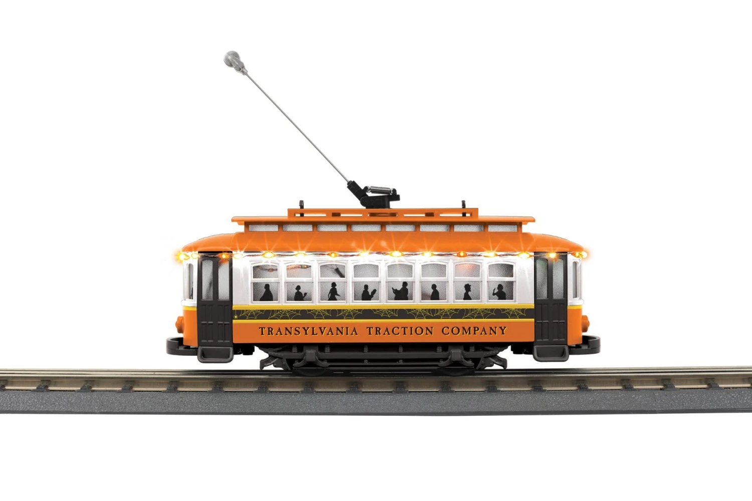 The colorful trolley features a lighted interior, metal wheels and gears and a long-lasting motor. The unit operates on any O Gauge track system and features an Automatic Bumper Reversing Mechansim (ABRM) that changes the carβs direction when it hits a track bumper.